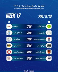 برنامه دیدارهای هفته های پانزدهم تا هفدهم لیگ برتر مردان به قرار زیر است: